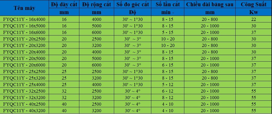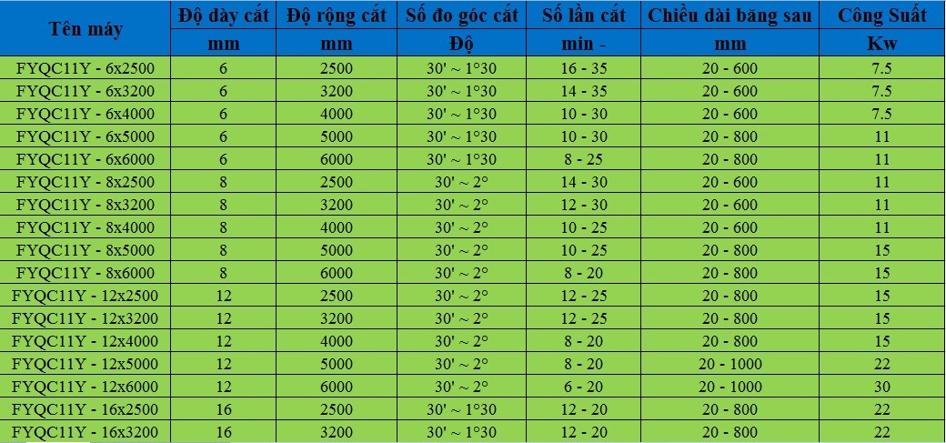 III. Thông số kĩ thuật các loại máy cắt tấm thủy lực FYQC11Y: