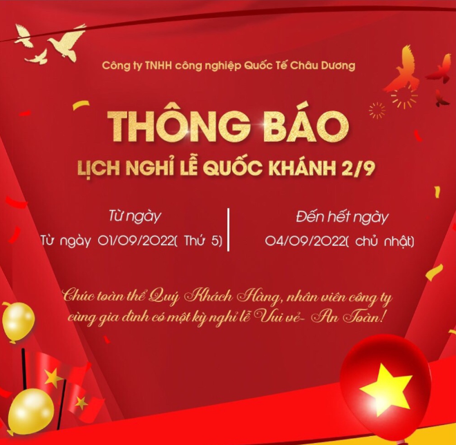 CÔNG TY TNHH CÔNG NGHIỆP QUỐC TẾ CHÂU DƯƠNG XIN TRÂN TRỌNG THÔNG BÁO LỊCH NGHỈ LỄ 02/09/2022 ĐẾN QUÝ KHÁCH HÀNG, QUÝ ĐỐI TÁC VÀ TOÀN THỂ NHÂN VIÊN CÔNG TY!