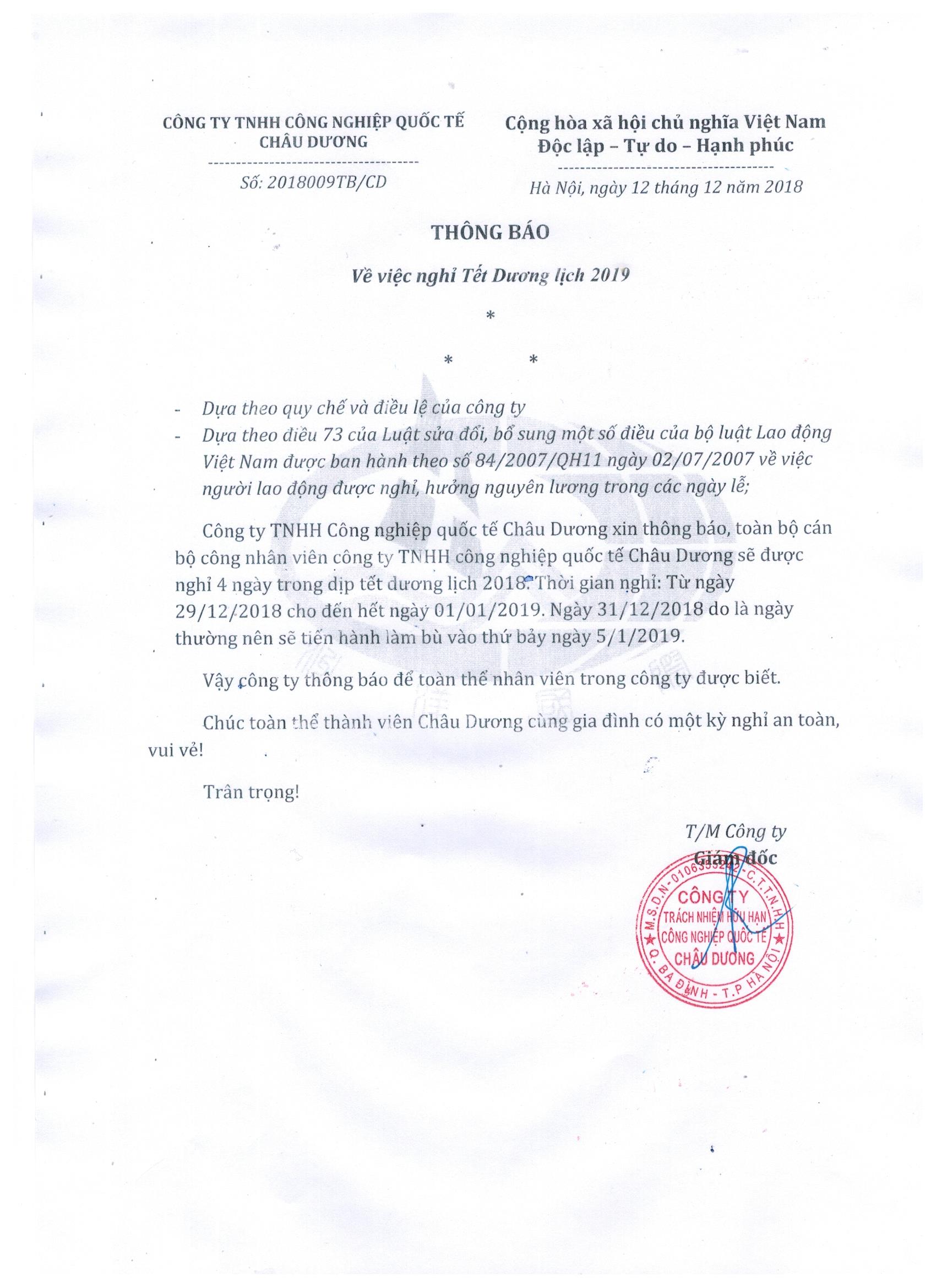 Chúng tôi xin thông báo đến Quý Khách hàng và Quý đối tác lịch nghỉ Tết Dương lịch của cán bộ nhân viên Châu Dương để khách hàng tiện liên hệ hỗ trợ.